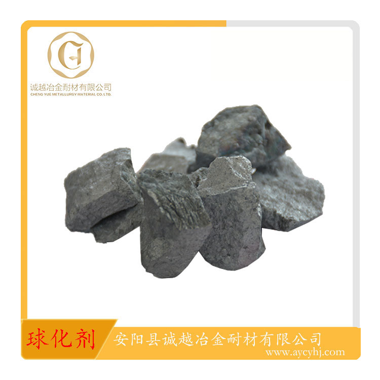 球化劑是使鑄鐵中的石墨呈球狀析出的鐵水添加劑。應用于鑄鐵鑄造領域。含鎂量4%、5%、5.5%屬于低鎂球化劑,RE在1%-2%之間,多用于中頻爐熔煉、低硫鐵液的球化處理。它具有球化反應和緩、球化元素易于充分吸收的優點。 含鎂量6%、7%屬中鎂系列球化劑,多用于沖天爐、電爐雙聯熔煉,或中頻爐熔煉珠光體型鑄態球墨鑄鐵鑄件。根據鑄件壁厚和原鐵水含硫量,確定合適的球化劑加入量,適用范圍廣,球化處理工藝寬泛。 高鎂系列球化劑,適合沖天爐熔煉、含硫量0.06%-0.09%的鐵液,加入量在1.6%-2.0%之間。 低鋁球化劑使用于容易產生皮下氣孔缺陷的鑄件,以及對鐵液含鋁量有要求的鑄件。 純Ce、純La生產的球化劑,球化處理后鐵液純凈夾雜物少、石墨球圓整。釔基重稀土生產的球化劑適合于大斷面鑄件,延緩球化衰退、防止塊狀石墨。含Sb球化劑用于珠光體型球墨鑄鐵。 低硅球化劑適用于使用大量回爐料的鑄造工廠;鎳鎂球化劑則用于高鎳奧氏體球墨鑄鐵。